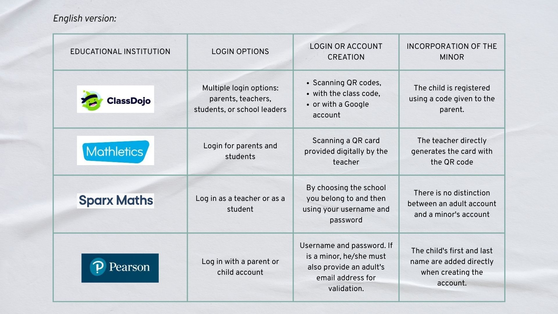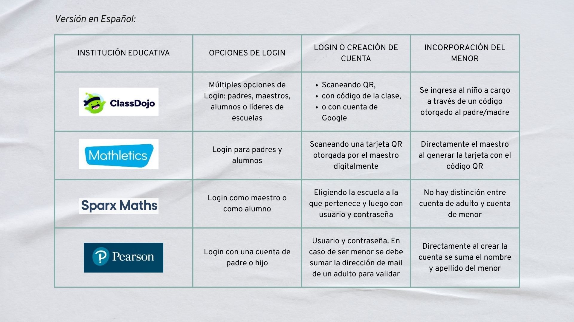 Conclusion: Most institutions had a more elaborate system through which teachers could grant access to the platforms, or physical classrooms provided codes for students. The institution for which we conducted this work opted for a simpler system similar to Pearson's, in which the parent or guardian first had to register and enter the child's information so that the child could then use the account.